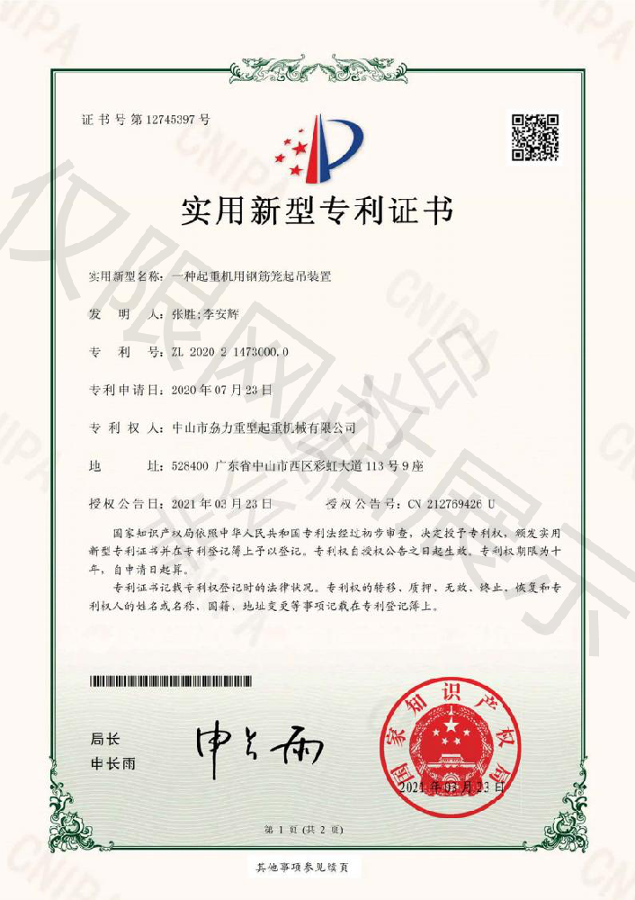 實(shí)用新型專利證書(shū) -- 起重機(jī)用鋼筋籠起吊裝置