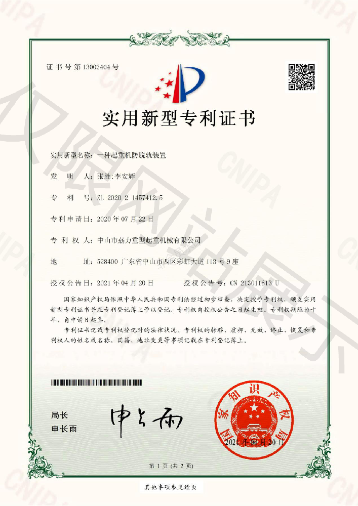 實(shí)用新型專利證書(shū) -- 起重機(jī)防脫軌裝置