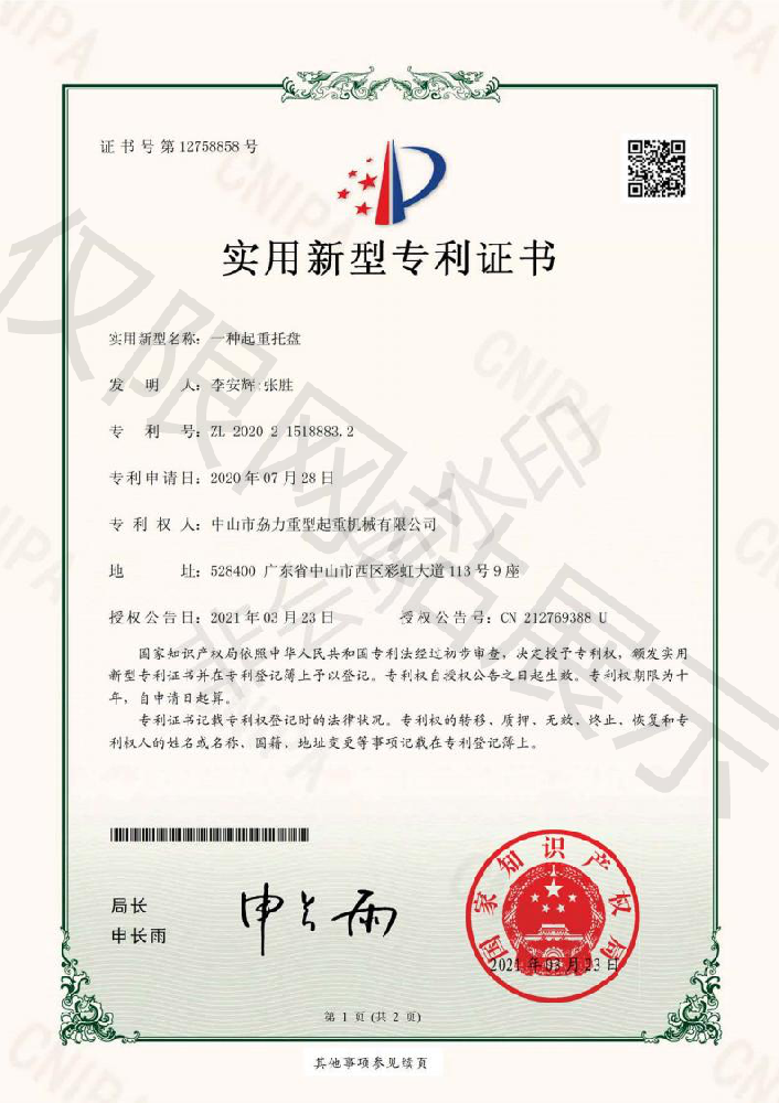 實(shí)用新型專利證書(shū) -- 起重托盤(pán)