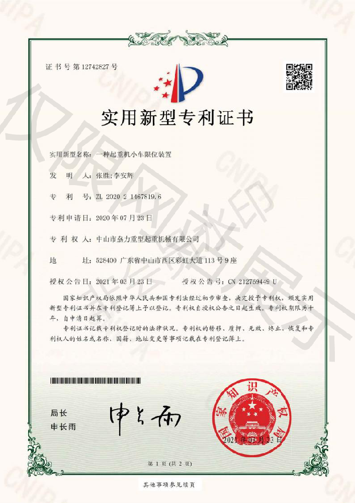 實(shí)用新型專利證書(shū) -- 起重機(jī)小車限位裝置