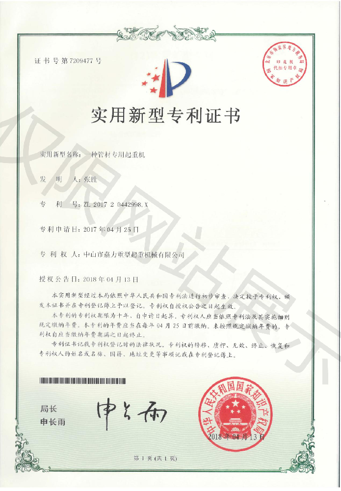 實(shí)用新型專利證書(shū) -- 管材專用起重機(jī)