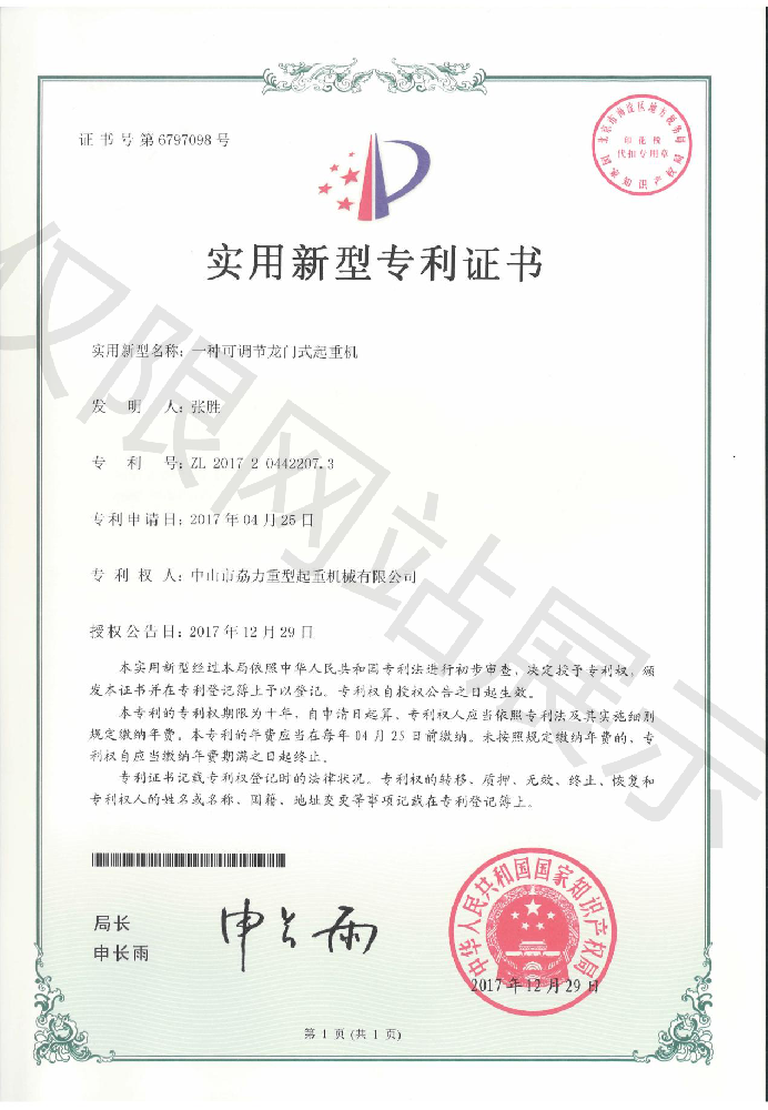 實(shí)用新型專利證書(shū) -- 可調(diào)節(jié)龍門(mén)式起重機(jī)