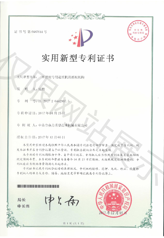 實(shí)用新型專利證書(shū) -- 管材專用起重機(jī)的抓取機(jī)構(gòu)
