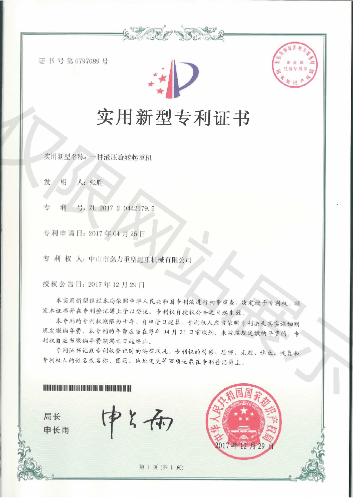 實(shí)用新型專利證書(shū) -- 液壓旋轉(zhuǎn)起重機(jī)